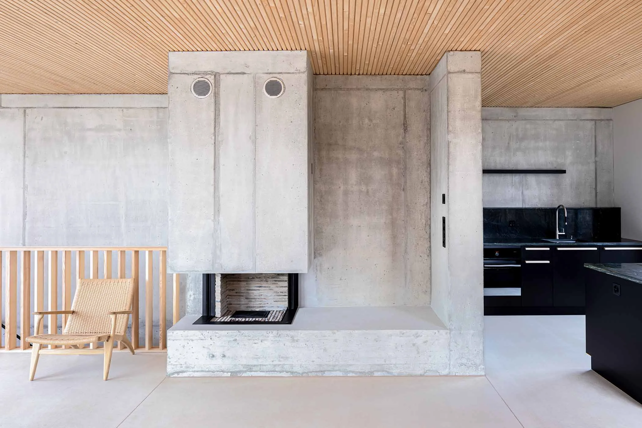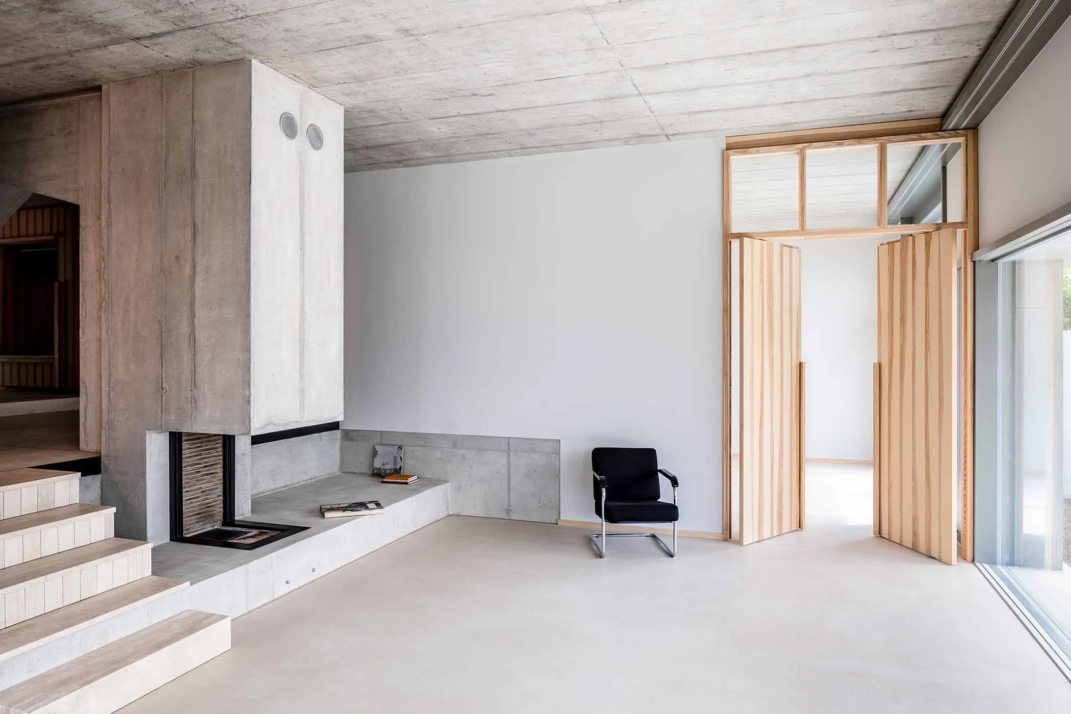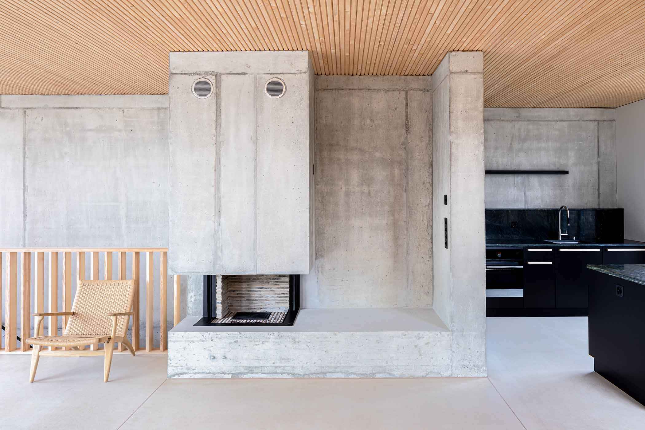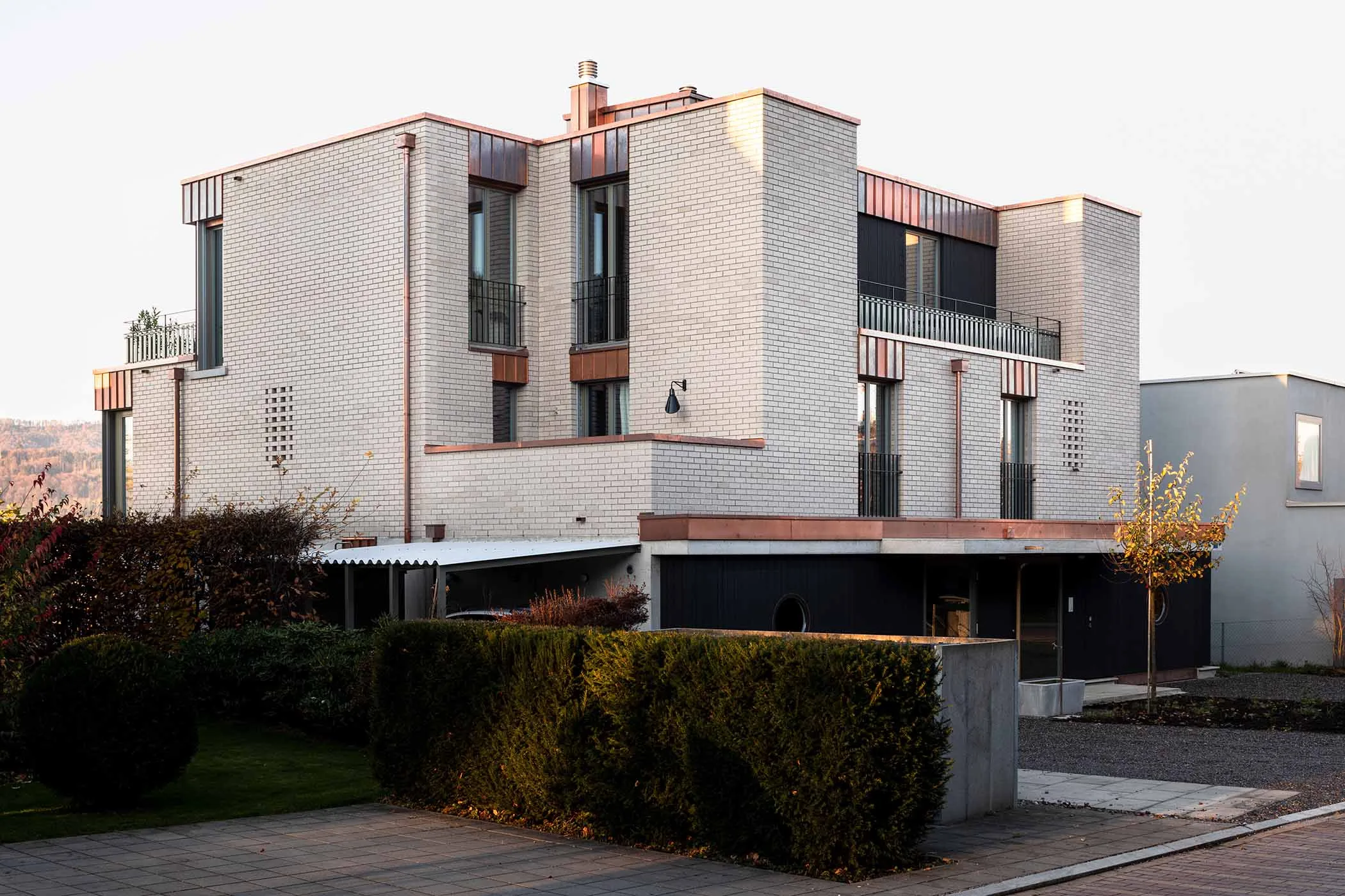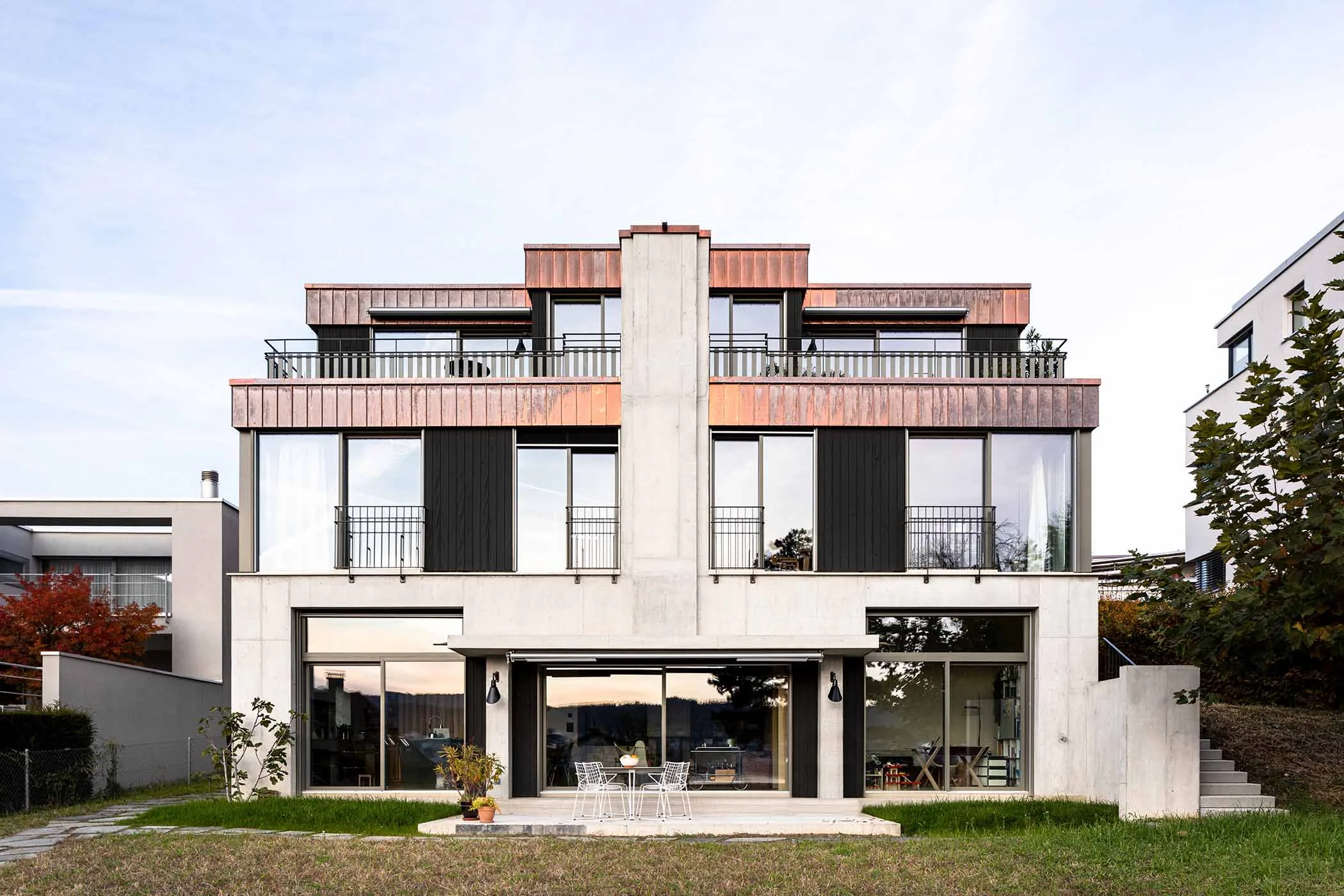 Das elegante Mehrfamilienhaus, das eine kleine Villa aus den 1930er-Jahren ersetzt, liegt in einer ruhigen Nachbarschaft an einem sonnigen Hang mit Blick auf den Zürichsee. Es umfasst eine Gartenwohnung im Sockel und zwei Maisonette-Wohnungen in den oberen Geschossen. Mit seinen ausladenden Terrassen und grosszügigen Öffnungen antwortet der Entwurf seeseitig auf die Aussichtslage und den Garten. Die Strassenseite weist dagegen einen eher unprätentiösen Charakter auf. Das Haus hebt sich mit seiner roh belassenen Materialisierung von den umgebenden Bauten ab. Ein ockerfarbenes Sichtmauerwerk ruht auf einem skulpturalen Betonsockel, der mit einer kaminartigen Vertikale über die oberen Geschosse hinausragt. Jede Wohnung verfügt über ein Betoncheminée, das sich aus der Tragstruktur des Hauses entwickelt und prominent das Zentrum der Wohnräume einnimmt.