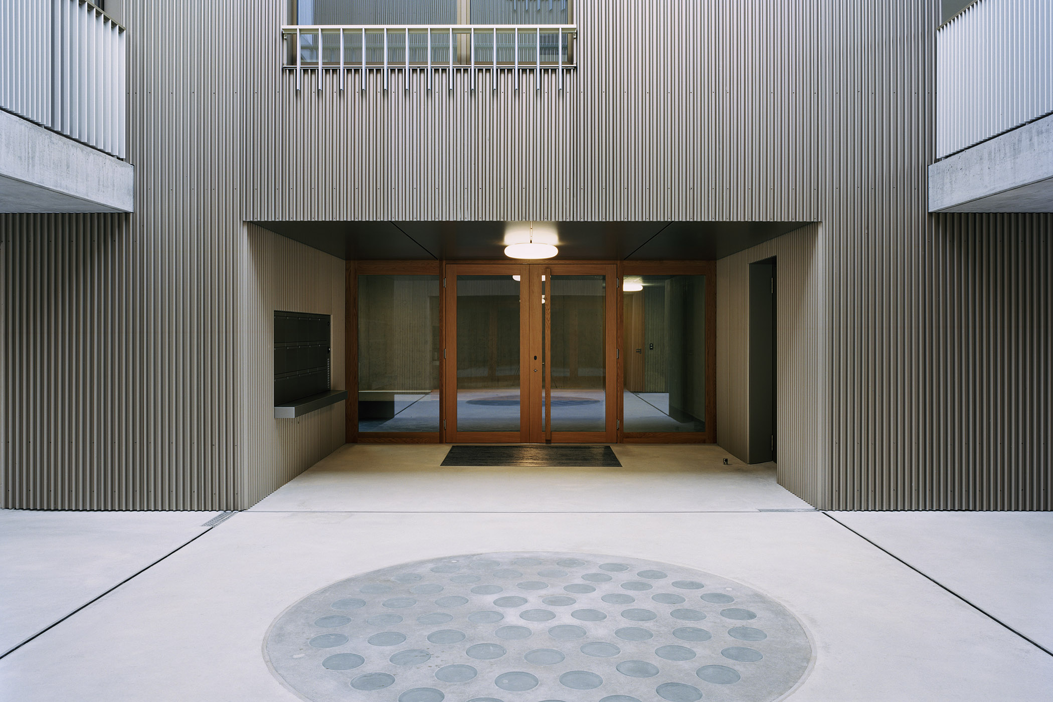 Die in Schwamendingen gelegene Parzelle der Baugenossenschaft Frohheim wird durch eine eigenständige Figur besetzt, die mit ihren Vor- und Rücksprünge und ihren drei Geschossen auf die kleinmassstäbliche Nachbarschaft reagiert. Über die Patios dringt das Licht bis in die offenen «Eingangspassagen». In Verbindung mit den darüber liegenden Balkonen entsteht eine horizontale sowie vertikale Perforation des Gebäudevolumens. Die bestehende Einfamilienhauszeile entlang der Tramstrasse wird durch zwei Reihenhäuser und dem Siedlungshaus ergänzt, das mit seiner monolithischen Sichtbetonfassade, den grossen Dachgauben und dem sich beidseitig öffnenden Saals sowohl eine selbstbewusste wie auch demütige Haltung im Quartier einnimmt.