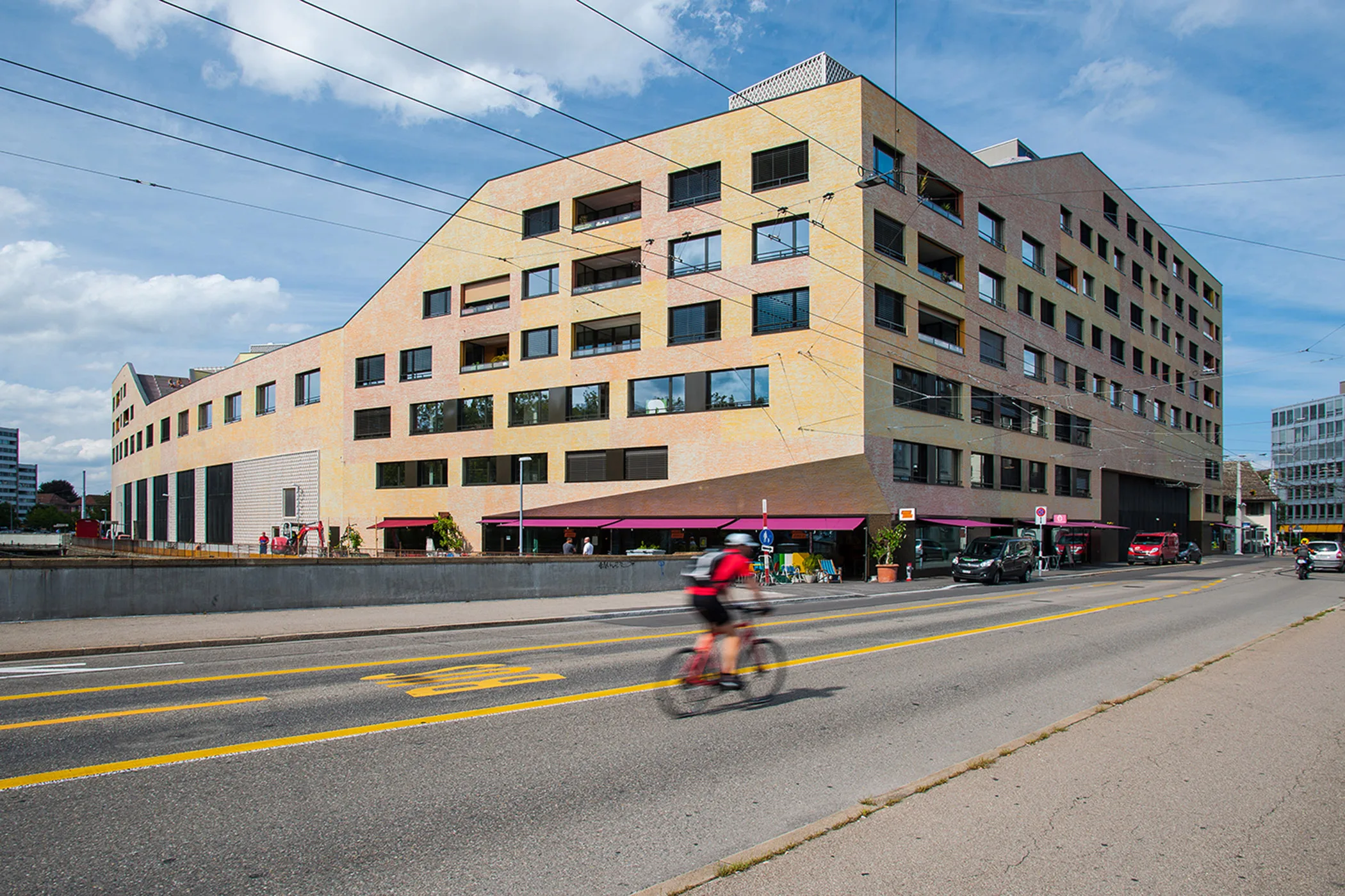 Aus der lokalen Initiative zur Schaffung einer Zukunftsperspektive für die Kalkbreite ist die erste Siedlung der gleichnamigen Genossenschaft entstanden. Sie hat das Areal 2007 im Baurecht von der Stadt Zürich übernommen und an städtebaulich prägnanter Stelle einen autofreien Wohn- und Gewerbebau nach den Zielen der 2000-Watt-Gesellschaft realisiert. In einer Vielzahl von Wohntypologien – von der 1-Zimmer-Clusterwohnung bis zur 17-Zimmer-Grossgemeinschaft – leben heute über 250 Menschen. Ein breiter Gewerbemix mit Läden, Restaurants und Kino bringt Mehrwert für das Quartier. Die Kalkbreite ist autofrei; dank vielen Veloparkplätzen und guter öV-Anbindung wird eine nachhaltige Mobilität gewährleistet.