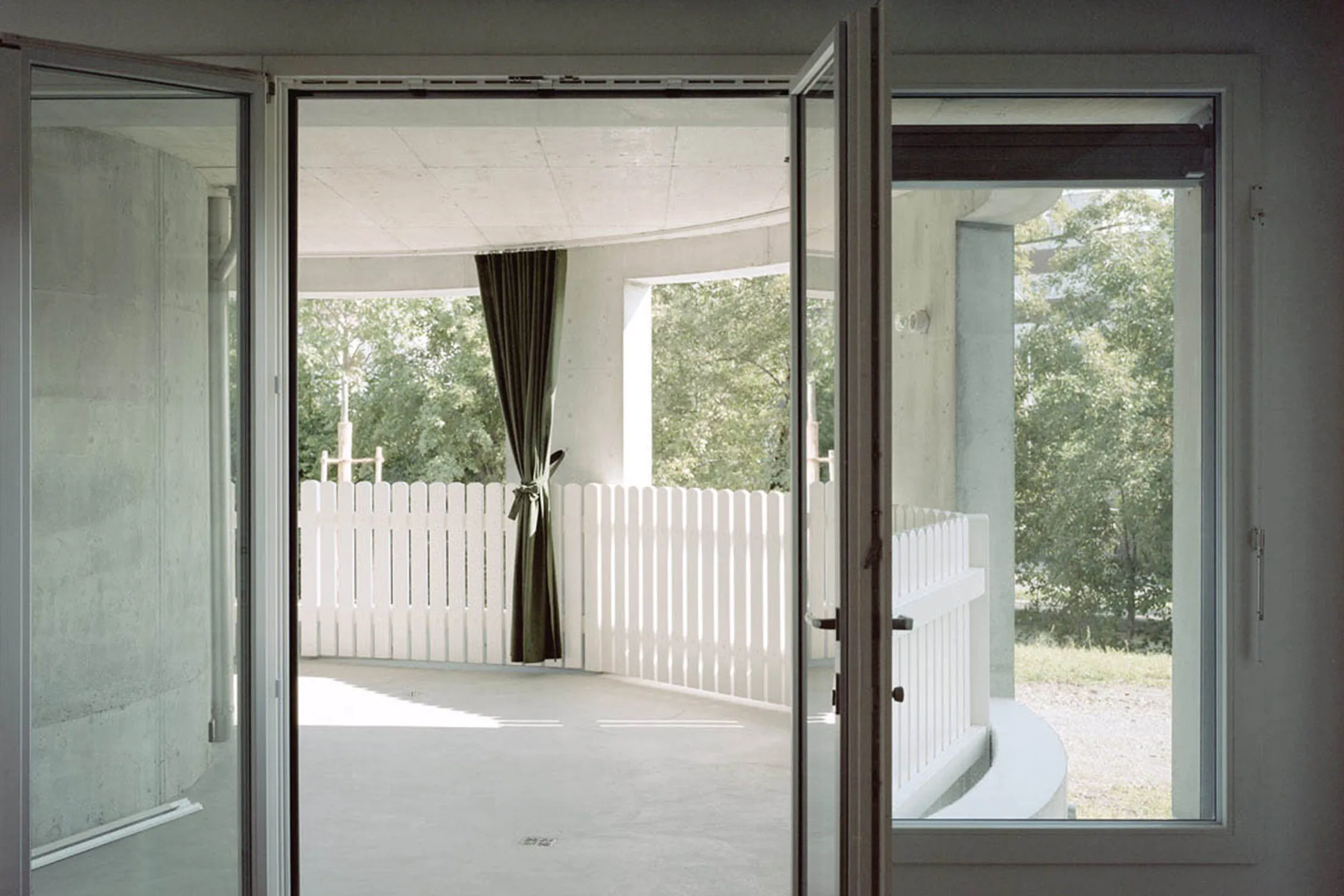 Wenn sie aus dem Park kommen, können sie das Treppenhaus benutzen, um über die Balkone in ihre Wohnungen zu gelangen: große, halbmondförmige Loggien, die mit Vorhängen versehen sind, wie ein zusätzliches Zimmer, mit Geländern aus weißen Holzlattenzäunen, die der Künstler Erik Steinbrecher geschaffen hat.