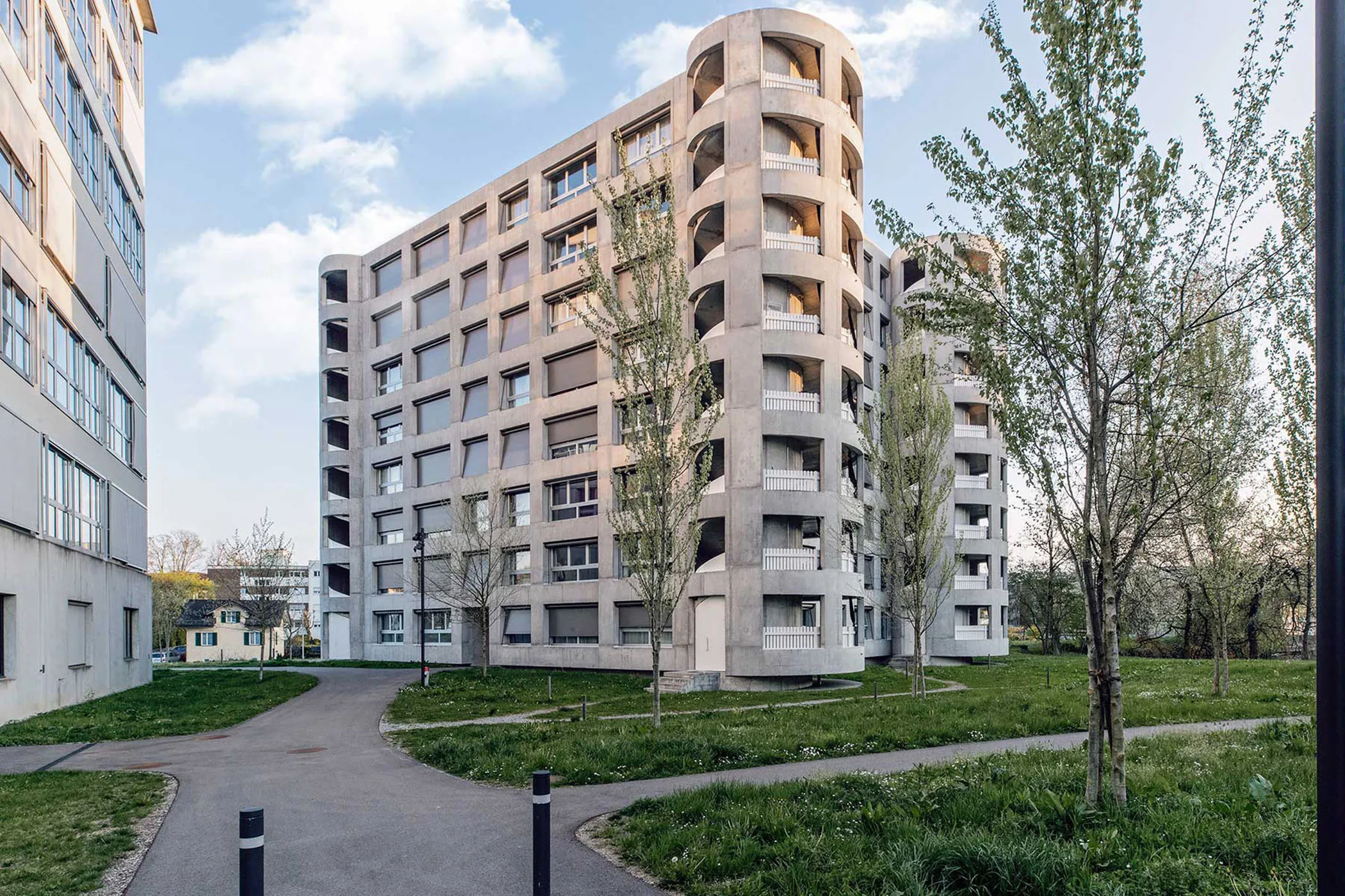 Die Erschliessungstypologie dieses Gebäudes bietet ein hohes Mass an Privatheit und einen lebendigen Kontakt mit der natürlichen Umgebung. Der Zugang zu den einzelnen Wohnungen erfolgt über zwei Aufzüge in der Mitte des Gebäudes, das keine gemeinsamen Flure hat. Die Treppenhäuser befinden sich an den vier Ecken des Gebäudes in Kombination mit großzügigen Balkonen, die jede Wohnung direkt mit dem Park verbinden. Diese runden Türme sind jeweils unterschiedlich positioniert, um sowohl die Sonneneinstrahlung als auch die Diskretion für die Mieter zu maximieren.