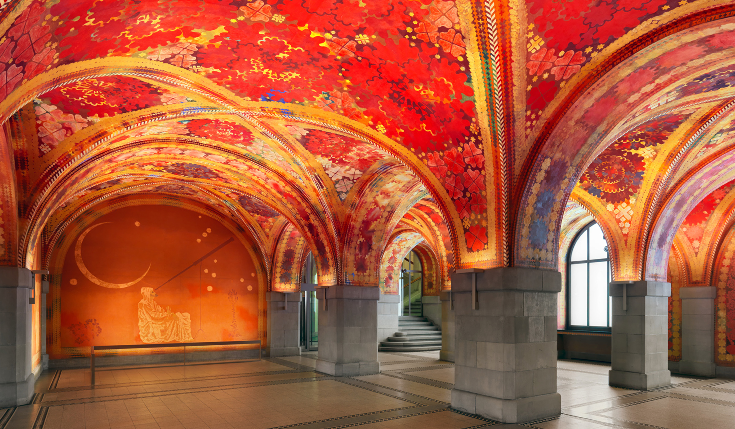 Mit dem Fresko von Augusto Giacometti (1877-1947) beherbergt die Regionalwache City der Zürcher Stadtpolizei eines der bedeutendsten Kunst-und-Bau-Werke der Stadt Zürich. Gustav Gull, bis 1900 Stadtbaumeister von Zürich und Architekt des Landesmuseums, wurde mit dem Umbau eines Waisenhauses in ein Amtshaus betreut. Um Platz zu sparen, wurde das ehemalige Kellergewölbe des Waisenhauses zum Eingangsbereich des Amtshauses umfunktioniert. Allerdings waren dessen Lichtverhältnisse nicht optimal, warum der Künstler Augusto Giacometti beauftragt wurde, das Deckengewölbe mit künstlerischen Mitteln aufzuhellen. Zwei Jahre lange arbeitete dieser mit hellen, aber warmen Farben an den Blumen-Ornamenten und szenischen Bildern und schuf bis 1926 den einzigartig leuchtenden Raum. Er musste aber auch Abstriche machen und verzichtete aus Kostengründen auf das vorgesehene Gold.Gleichwohl erlangte seine von Rot-Orange-Tönen dominierte Malerei eine Leuchtkraft von geradezu sakralem Charakter.