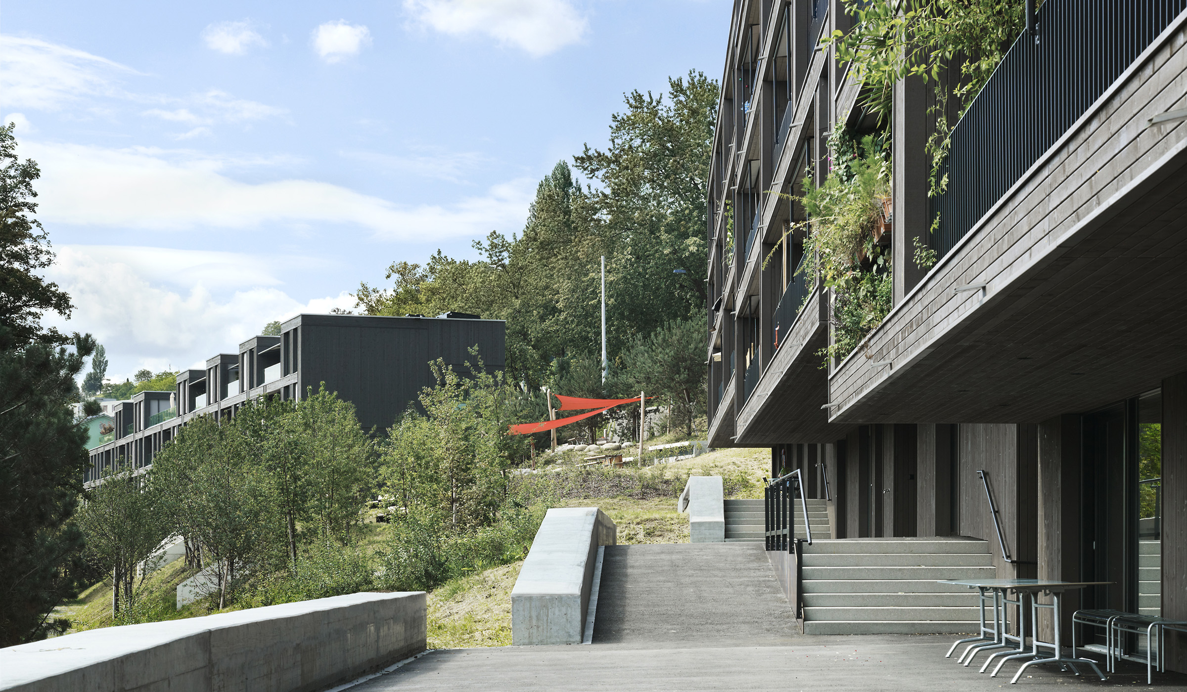 Die Gebäude der Siedlung besitzen eine dunkel gestrichene, sägerohe Holzfassade. Diese tritt als Geflecht mit vertikalen und horizontalen Elementen zum Vorschein. Mit einer inneren tragenden Betonstruktur gewährleistet die Fassade bei einem kompakten Wandaufbau einen hochwertigen Wärmeschutz.