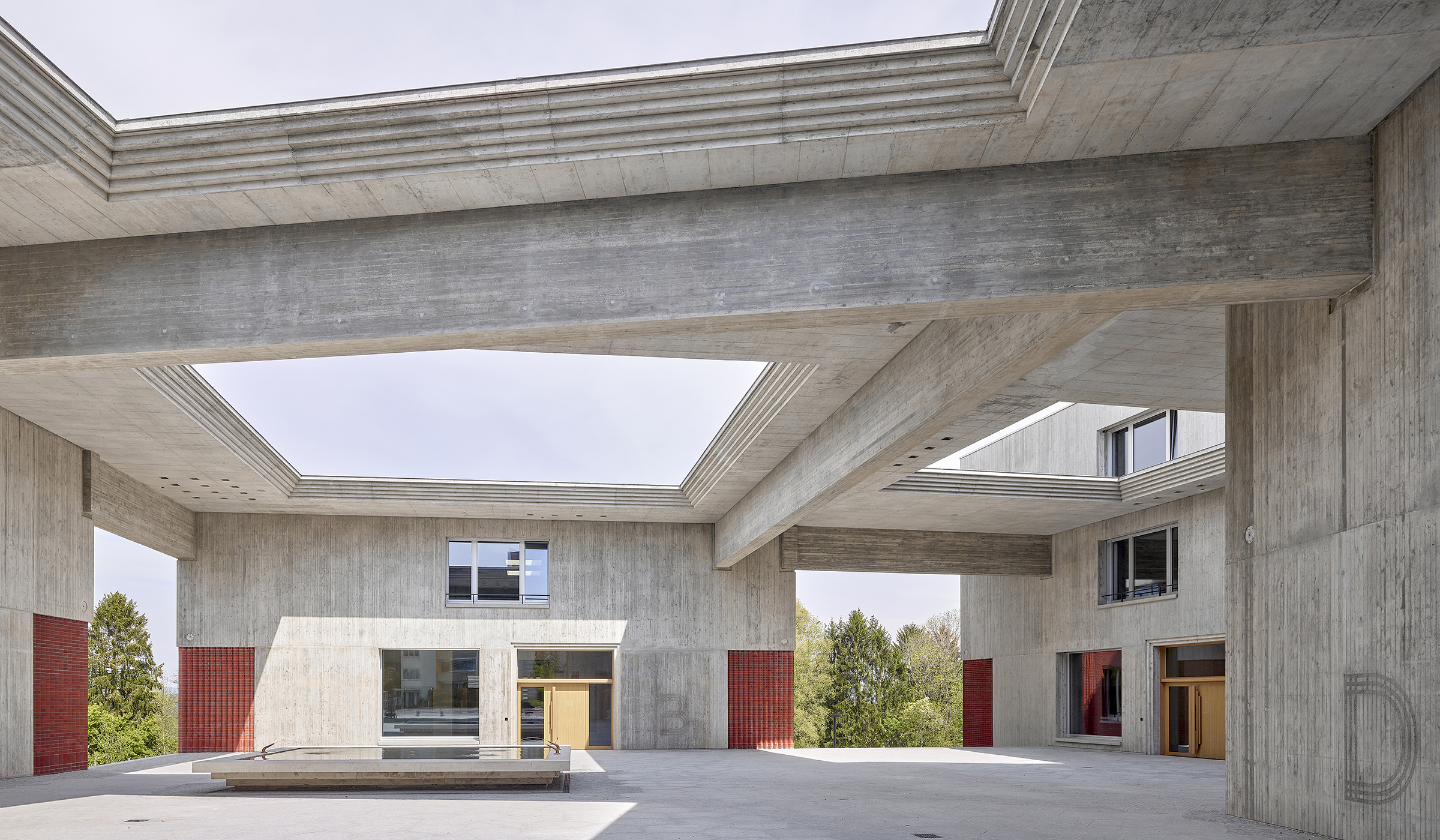 Ein grosses Dach verbindet vier kompakte Baukörper miteinander und schafft einen grosszügigen überdachten Schulhausplatz – das Herz der neuen Schulanlage Schauenberg. Die leichten Ausdrehungen der vier Baukörper verleihen der Figur eine organische Ausstrahlung und vermitteln gleichzeitig zwischen den verschiedenen Geometrien des Ortes. Die vier Zugänge knüpfen an den bestehenden Wegverbindungen an und vernetzen die Schulanlage eng mit dem Wohnquartier. Die neue Schule ist aus einzelnen Trakten aufgebaut, die um den zentralen Schulhausplatz gruppiert sind. Im Erdgeschoss der einzelnen Häuser sind die gemeinschaftlichen Nutzungen der Schule angeordnet. In den Klassentrakten sind drei Klassenzimmer, vier Gruppenräume und ein Aufenthaltsraum jeweils zu einem autonomen Cluster zusammengefasst. Zusammen bilden die Teile ein vielschichtiges Ganzes, in dem die Schule als Gemeinschaft erlebbar ist.